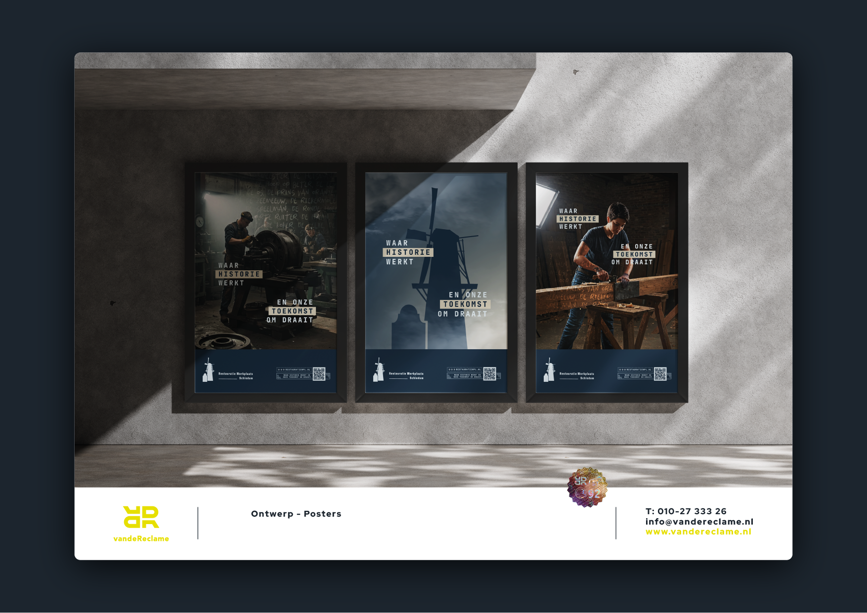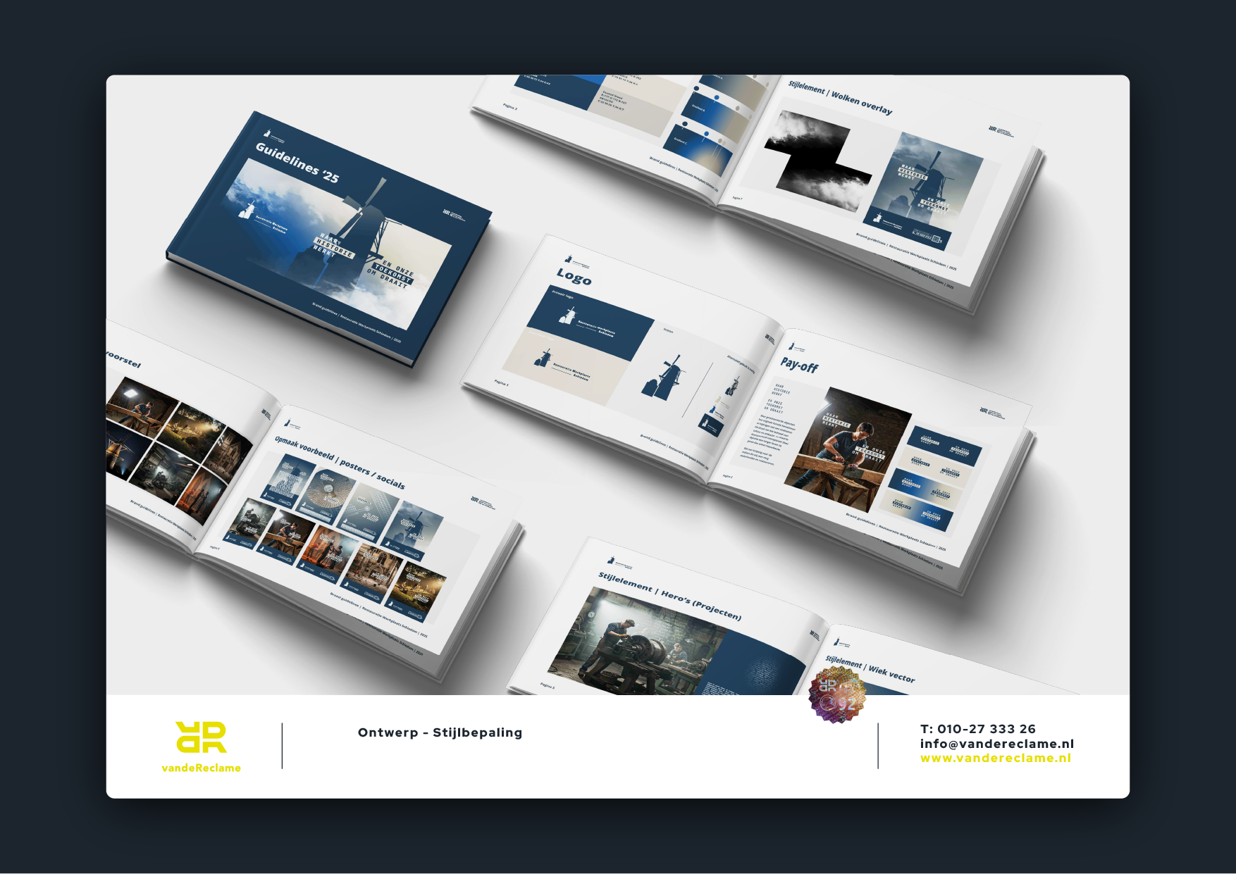 Voor onze klant Restauratie Werkplaats Schiedam werkten we aan een huisstijl die net zo sterk is als het vakmanschap dat zij dagelijks inzetten. De restauratiewerkplaats ademt historie, werkt met originele materialen en draagt zorg voor eeuwenoude objecten – van monumentale panden tot draaiende molens.